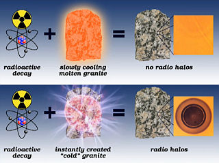 Dr. Robert Gentry on teinud uurimuse radioaktiivsete poloonimi halode kohta. Ta tegi hämmastavaid avastusi polooniumi halodest. Ta avastas üle kogu maailma, et graniidis on pisikesed rõngad. Ilma hea miksoskoobita neid näha ei ole. Neid http://www.youtube.com/watch?v=pEMDqTxfkmM&feature=player_embedded#t=3m39s">rõngaid võiks võrrelda käsigranaadi plahvatusega moosis. Kõik killud lendaksid laiali ja oleksid moosis kinni. Kui sul on suur tükk moosi, siis see moodustuks halo/kiirtepärja. Kui plutoonium laguneb, see saab välja osakesi ja need liiguvad kindla kauguseni. See lõpetab sarnaselt käsigranaadile. Tekib ring väikestest osakestest. Kui see juhtub kuumas sulakivimis, see laguneb ja moodustub väikse halo ja see kaob ära, nagu ilutulestik. Kui lastakse ilutulestikku, tekib ilus ring taevas. See ei püsi seal ja langeb alla. Polooniumil on lühike poolelu. Kui see tegi polooniumi langemisel väikese halo ja kivim oleks olnud kuum, see see halo kaoks ära. Kui kivim on juba jahtunud, siis jääks rõngas sellest järgi. Neid rõngaid on leida kõikjal üle maailma. Robert Gentry tegi palju uurimusi sellest ja ütles, et need kivimid ei olnud kunagi kuum sulamass, kuna see on poloonium, see on originaal. See ei ole millegi kõrvalprodukt ning see jättis endast rõngad maha. Kivim ei olnud kunagi kuum.
